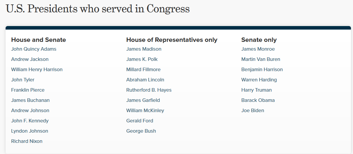 Governance is a complex endeavor. The skill set of an effective legislator may be inconsistent with what is needed to be an effective administrator, and even the most accomplished administrator may lack the qualities of leadership required by a chief executive. If we include the charisma and communication skills necessary to win a statewide or national election, few persons, woman or man, are qualified for chief executive office. A quick review of current women in the House and Senate shows how few of them have executive branch experience at any level of government. Of the 24 women currently in the Senate, only one (Democrat Maggie Hassan of New Hampshire) was a governor. Among the 122 House members who are women, there is one with a smattering of executive experience (one year as Lieutenant-Governor). In a similar vein to a governor, winning election to a Federal office has been a strong indicator of a person’s chances to be President. As this table from PresidentsUSA.net shows, 17 of the 46 men elected President were Senators; only nine grabbed the brass ring without at least one term in the Senate.