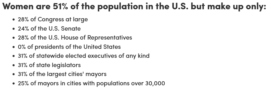 But it is in electoral politics that the discrepancy between women and men is most apparent. While it is true that Vice-President Kamala Harris and Speaker of the House Nancy Pelosi are number two and three respectively in the Presidential line of succession, and that the number of female Senators has steadily increased over the last 50 years, overall, women are not represented in elected office in proportion to their demographic (they are slightly more than 50% of the population). These statistics from RepresentWomen.org are telling: